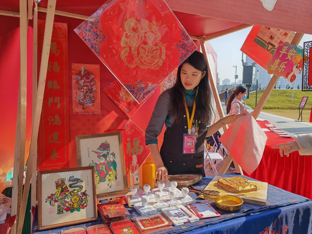 在廣東省非遺館舉辦的非遺項(xiàng)目年貨大集上,劉鐘萍在展示佛山木版年畫。新華社記者 鄧瑞璇 攝