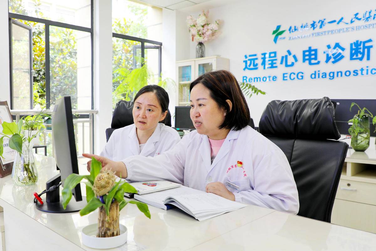 2024年6月4日,仙桃市第一人民醫(yī)院遠(yuǎn)程心電診斷中心醫(yī)護(hù)人員,正在遠(yuǎn)程判讀長埫口鎮(zhèn)一患者診斷結(jié)果,給出合理治療方案。(視界網(wǎng) 劉賢雙 攝)