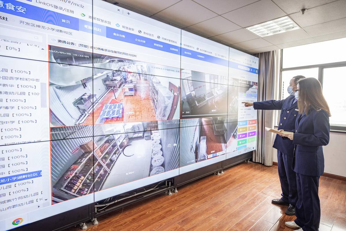 武漢經(jīng)開區(qū)市場監(jiān)管工作人員在食品安全智慧監(jiān)管平臺中控室進(jìn)行系統(tǒng)升級調(diào)試。(湖北日報全媒記者 柯皓 通訊員 劉前鋒 王志波 攝)