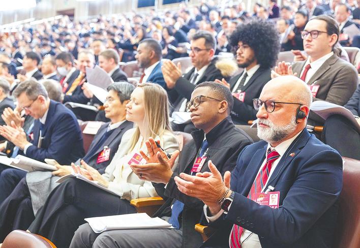 他們戴著耳機(jī),認(rèn)真聆聽同聲傳譯,翻看政府工作報(bào)告譯本,不時(shí)圈畫、記錄。