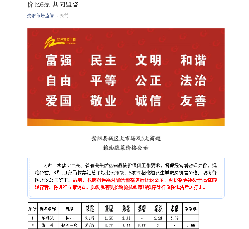 進(jìn)一步落實(shí)省、市、縣有關(guān)生活必需品穩(wěn)價(jià)保供應(yīng)工作要求,督促經(jīng)營者合理定價(jià),規(guī)范經(jīng)營,收集匯總城北大市場(chǎng)、5家商超糧油及生鮮蔬菜銷售價(jià)格,進(jìn)行“崇陽縣城區(qū)大市場(chǎng)及5大商超糧油蔬菜價(jià)格”比較公示,對(duì)價(jià)格連續(xù)處于高位的經(jīng)營者,進(jìn)行立案調(diào)查,發(fā)現(xiàn)有哄抬物價(jià)擾亂市場(chǎng)秩序等行為將依法嚴(yán)厲打擊。