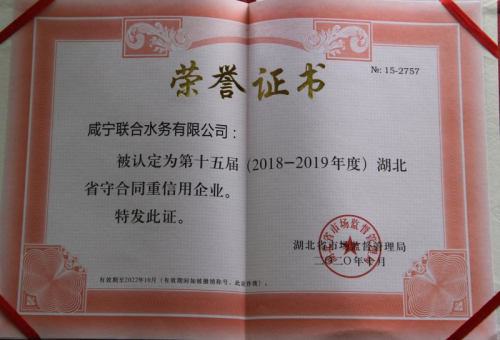 咸寧網(wǎng)訊?通訊員?林立:日前,咸寧聯(lián)合水務(wù)有限公司榮獲湖北省第十五屆(2018-2019年度)“守合同重信用”企業(yè)榮譽(yù)。此項(xiàng)榮譽(yù)稱號的獲得,是省市場監(jiān)督管理局和社會各界對咸寧聯(lián)合水務(wù)長期以來堅(jiān)持誠信經(jīng)營、嚴(yán)守合同、持續(xù)發(fā)展的充分肯定。