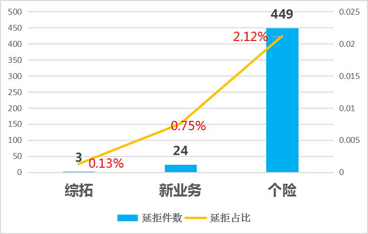 2021年1月總延拒件數(shù)為476件,各機構(gòu)延拒件數(shù)以及占各機構(gòu)1月受理到賬保單件數(shù)的占比為: