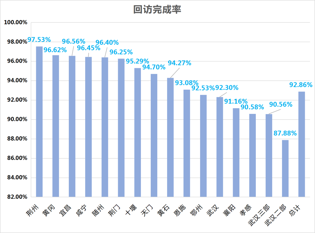 2021年1月,全省共16787件新契約回訪案件,已完成回訪15589件,完成率92.86%;荊州、黃岡、宜昌位列前三,武漢二部未達90%。