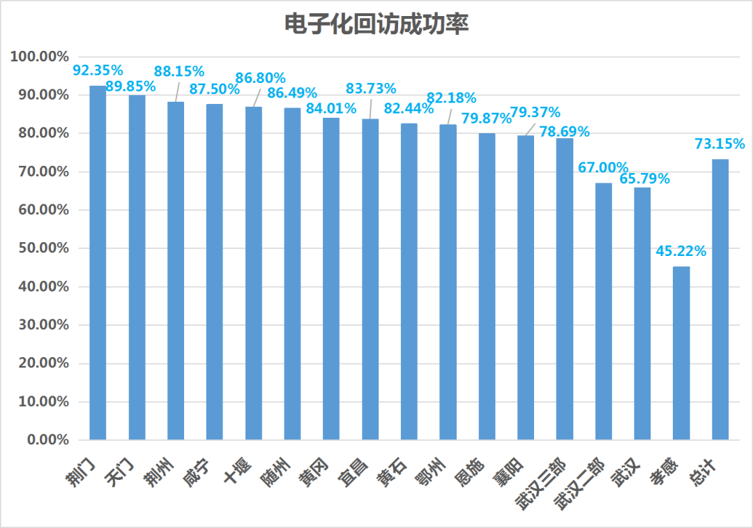 全省共16787件新契約回訪案件,電子化回訪12280件,電話回訪4507件,電子化率73.15%;荊門、天門、荊州位列前三,武漢一部、武漢二部未達70%,孝感未達50%。