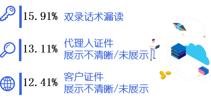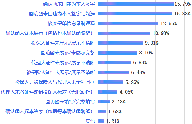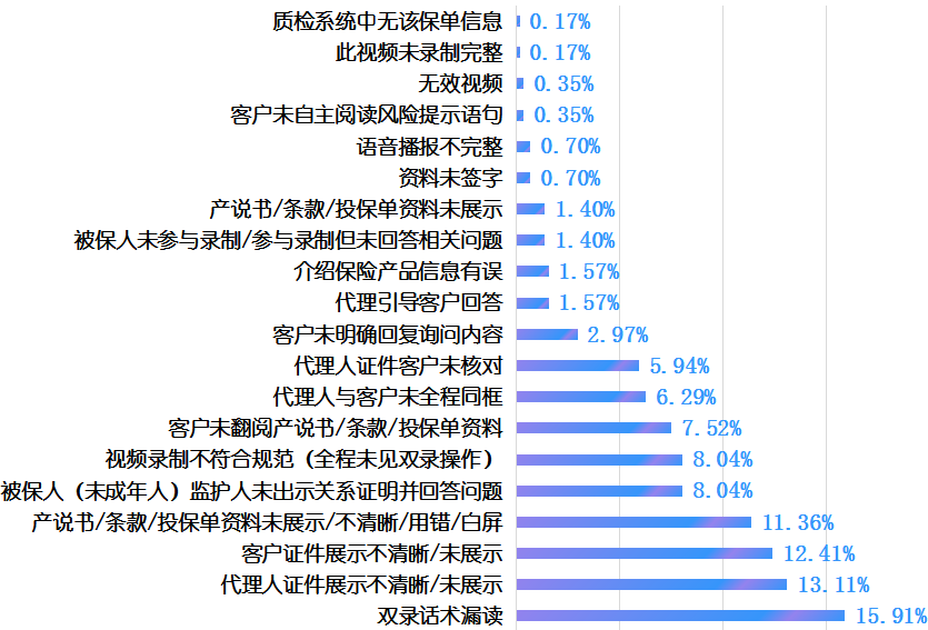 2020年,全省質(zhì)檢問題件率為73.23%。根據(jù)全省保單雙錄具體情況將目前已產(chǎn)生的質(zhì)檢問題歸納為20類,具體情況如下: