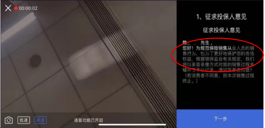“雙錄”語音播報(bào)環(huán)節(jié)增加播報(bào)完整性校驗(yàn),即在語音播報(bào)進(jìn)入下一環(huán)節(jié)前,需要完整播報(bào)本環(huán)節(jié)所有話術(shù)內(nèi)容,否則無法點(diǎn)擊“下一步”。