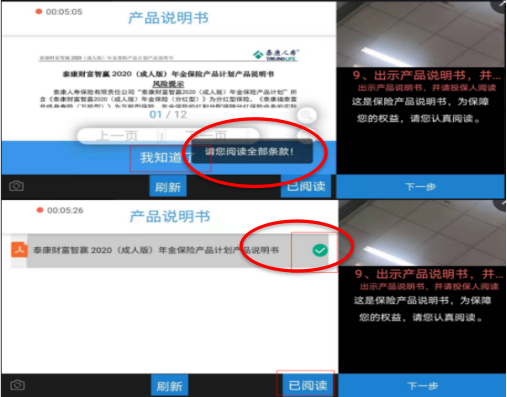 未翻閱到最后一頁,系統(tǒng)提示“投保資料未閱讀完,請確定是否下一步”。當(dāng)點(diǎn)擊確定時(shí)可進(jìn)入下一步錄制,當(dāng)點(diǎn)擊取消繼續(xù)閱讀投保資料。