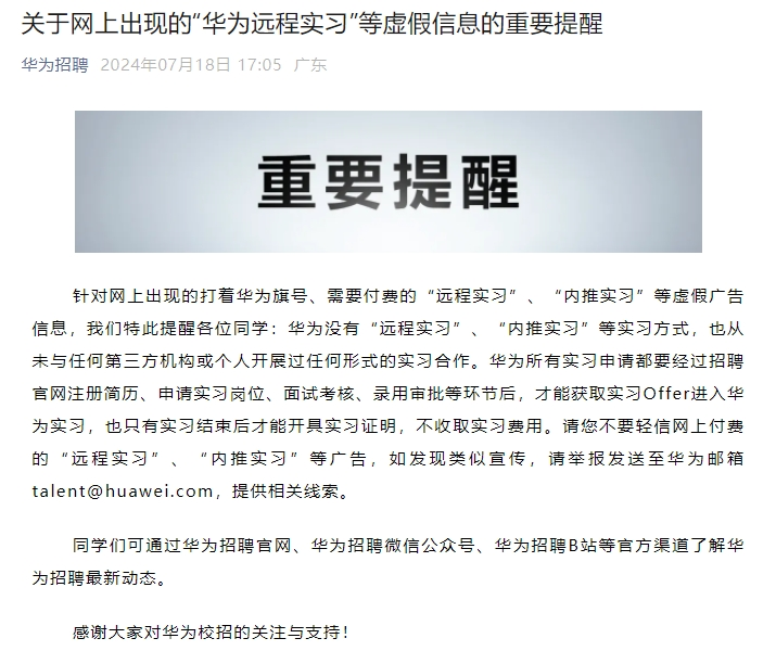 華為招聘官方公眾號7月18日下午發(fā)布消息,對于網(wǎng)上出現(xiàn)的“遠(yuǎn)程實(shí)習(xí)”、需要付費(fèi)的“內(nèi)推實(shí)習(xí)”等內(nèi)容進(jìn)行辟謠。