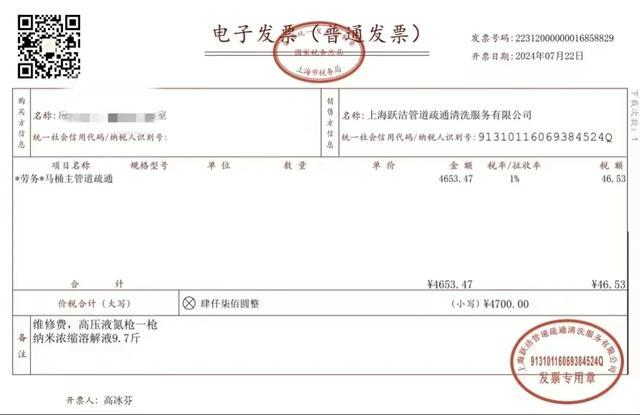 即便如此,馬桶管道依然未能疏通,對(duì)方再次向胡女士推銷‘進(jìn)口液氮槍“并保證”一槍下去肯定通’,而這一槍的費(fèi)用也要近千元。最終維修師傅總報(bào)價(jià)高達(dá)4700元,付款方式則是直接轉(zhuǎn)賬而非平臺(tái)支付。