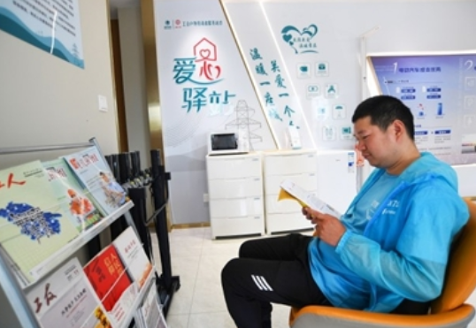 50多平方米的愛心驛站除空調(diào)、水、WIFI這些基本配置,還提供臨時(shí)休息、熟食加熱、書籍閱讀、手機(jī)充電,修車充氣等5大類20多項(xiàng)...