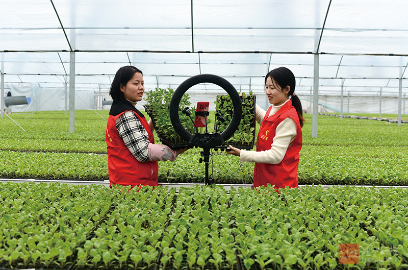 2月17日,在通城縣北港鎮(zhèn)莊前村綠康蔬菜集約化育苗基地大棚內(nèi),當(dāng)?shù)鼐W(wǎng)紅直播銷售辣椒、茄子苗。劉建平攝(影像咸寧)。