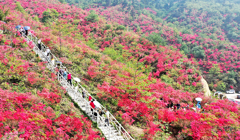 4月20日,走進(jìn)通山縣黃沙鋪鎮(zhèn)大幕山,千畝野生杜鵑相繼綻放,映紅山嶺,蔚為壯觀,引來(lái)各地游人登山賞花。