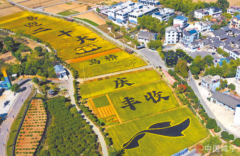 10月11日,咸安區(qū)馬橋鎮(zhèn)曾鋪村建國(guó)畈,無人機(jī)鏡頭下的稻田一派豐收的景象。眼下金秋時(shí)節(jié),百畝彩色水稻迎來最佳觀賞期。